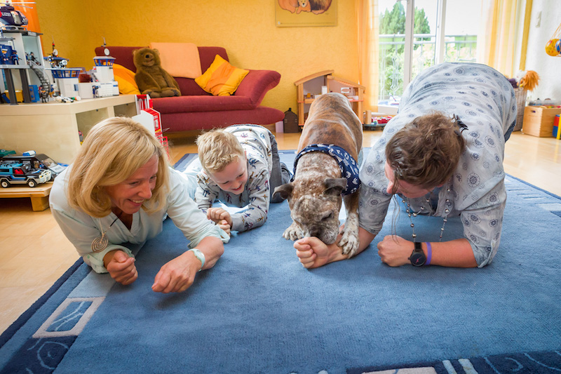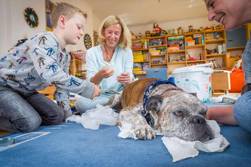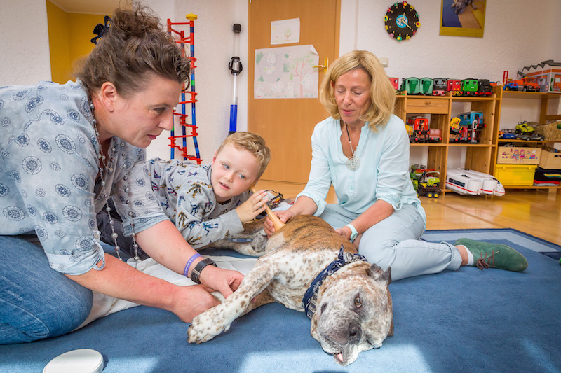 Im Team mit dem Therapiehund „Bolle“, seiner Besitzerin und Trainerin Stefanie Huber, mir als Therapeutin und dem zu behandelnden Kind/Jugendlichen finden sehr individuelle, den Besonderheiten des Einzelnen entsprechende gemeinsame Therapiestunden statt. Im vertrauensvollen, sicheren Rahmen macht das Kind/der Jugendliche über und mit Bolle Erfahrungen die es/ihn ermutigen, seine Fähigkeiten zu zeigen und zu entdecken, sich zu trauen und zu vertrauen. Bolle ist stets aufmerksam, absichtslos, annehmend und passt sich dem Kind/Jugendlichen an. Er spiegelt dem Kind/Jugendlichen seine Eigenarten, ermutigt und löst darüber Gefühle bei seinem Gegenüber aus die Freude, Stolz, Selbstwirksamkeit, Entspannung und Selbstvertrauen beinhalten.